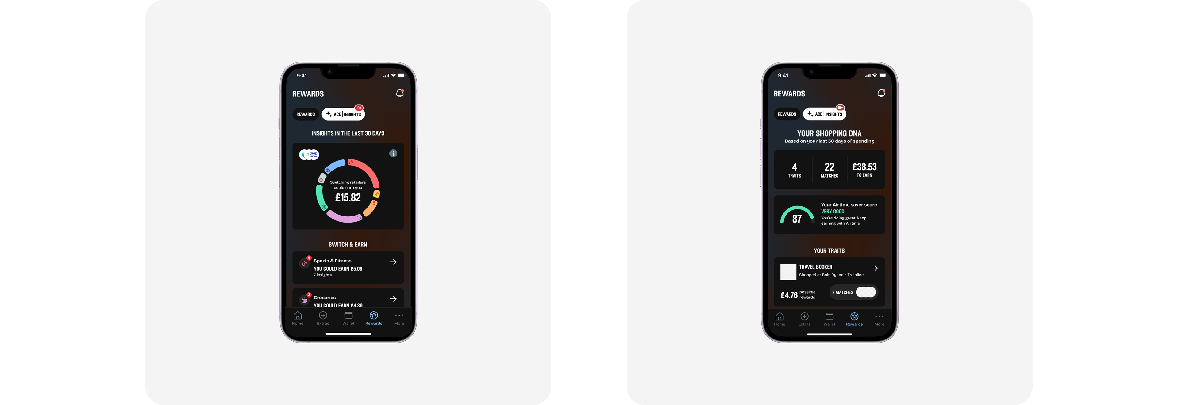 We decided to do 2 versions of Insights. This is so we could test with our user's to see if they preferred more transparency around their banking data or more of a gamified experience. On the left we have a version that shows 1-1 direct comparisons of places they have shopped previously and retailers on the Airtime platform they could earn rewards with. On the right is a persona based score for users to improve the more they shop with retailers on our platform. We tested the both of these to get feedback and align on direction.